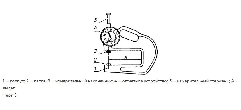 Прибор представляет собой скобу, в которую установлен индикатор в качестве отсчетного устройства, а также неподвижная пятка. Для отвода измерительного наконечника индикатор снабжен арретиром.